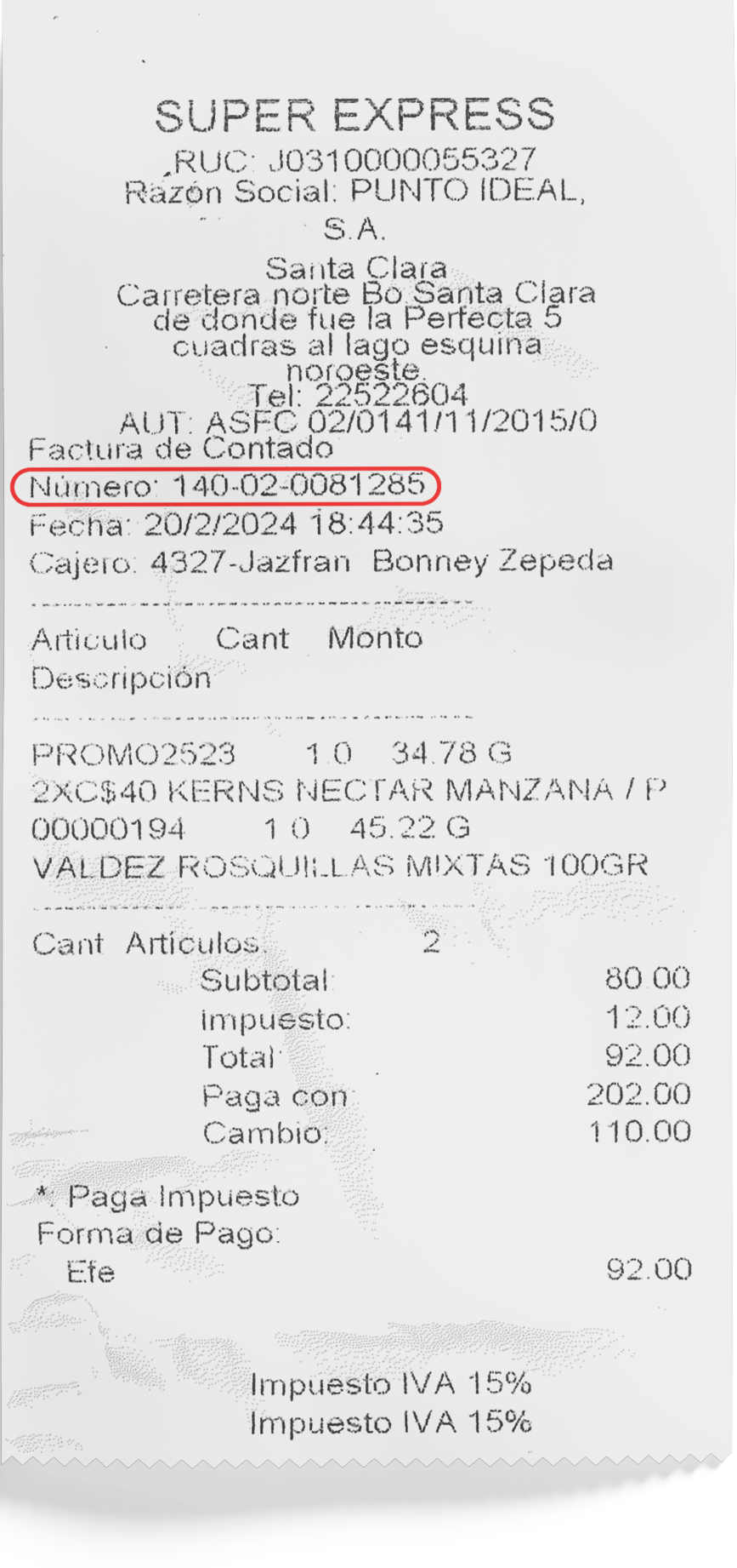 Encontrá el número de 12 dígitos en la parte superior de tu factura, junto a la fecha en la que realizaste la compra.